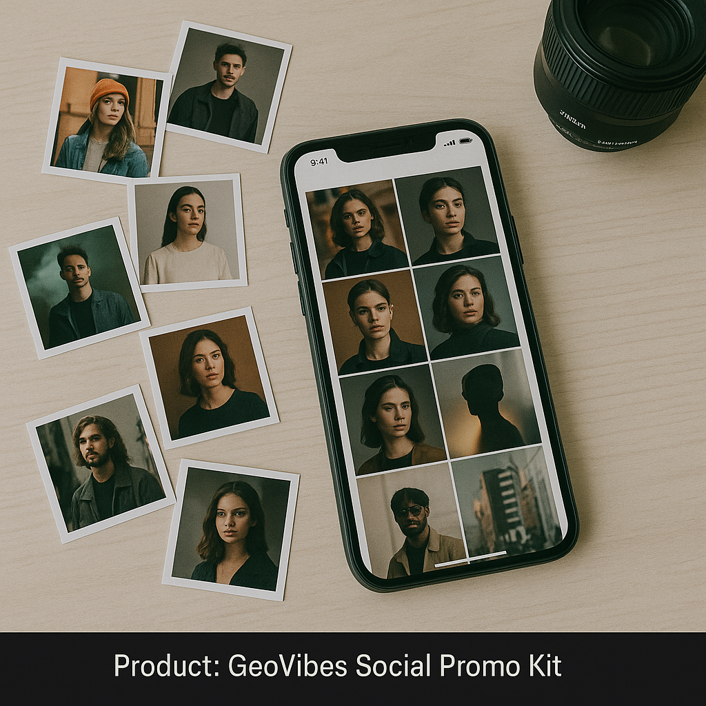 You decide to promote a new “Cinematic Portrait Session” offer. Instead of starting from a blank canvas, you open the GeoVibes Social Promo Kit, choose a Reel cover, a story sequence, and a feed announcement post, drop in your images and key offer text, and schedule everything for the week in one sitting. The visuals look consistent and premium, and every post clearly explains what the offer is, who it is for, and how to book.